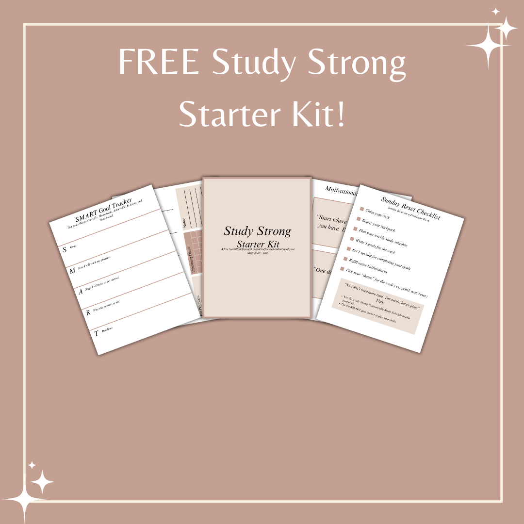 For students who are ready to go from “just surviving” to truly thriving. Study Strong Plus is a private membership for ambitious students who want next-level support. You’ll get monthly tools, printable planners, exclusive blog posts, study challenges, and more — for just $3 per month.